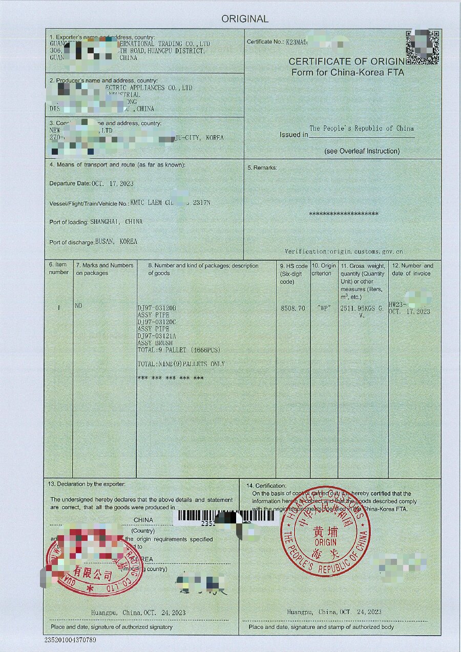 中韓自由貿(mào)易協(xié)定原產(chǎn)地證書(shū)