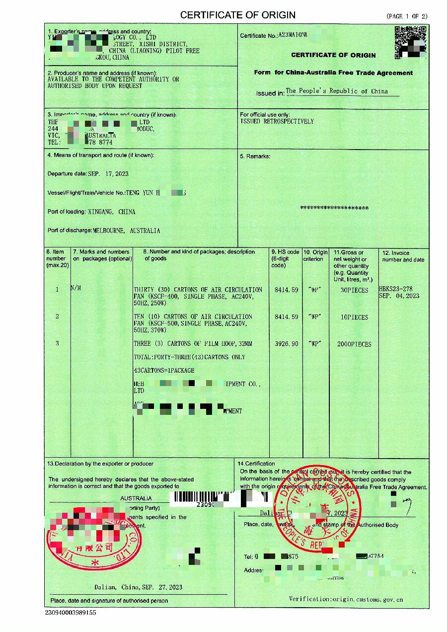 中澳自由貿(mào)易協(xié)定原產(chǎn)地證書(shū)
