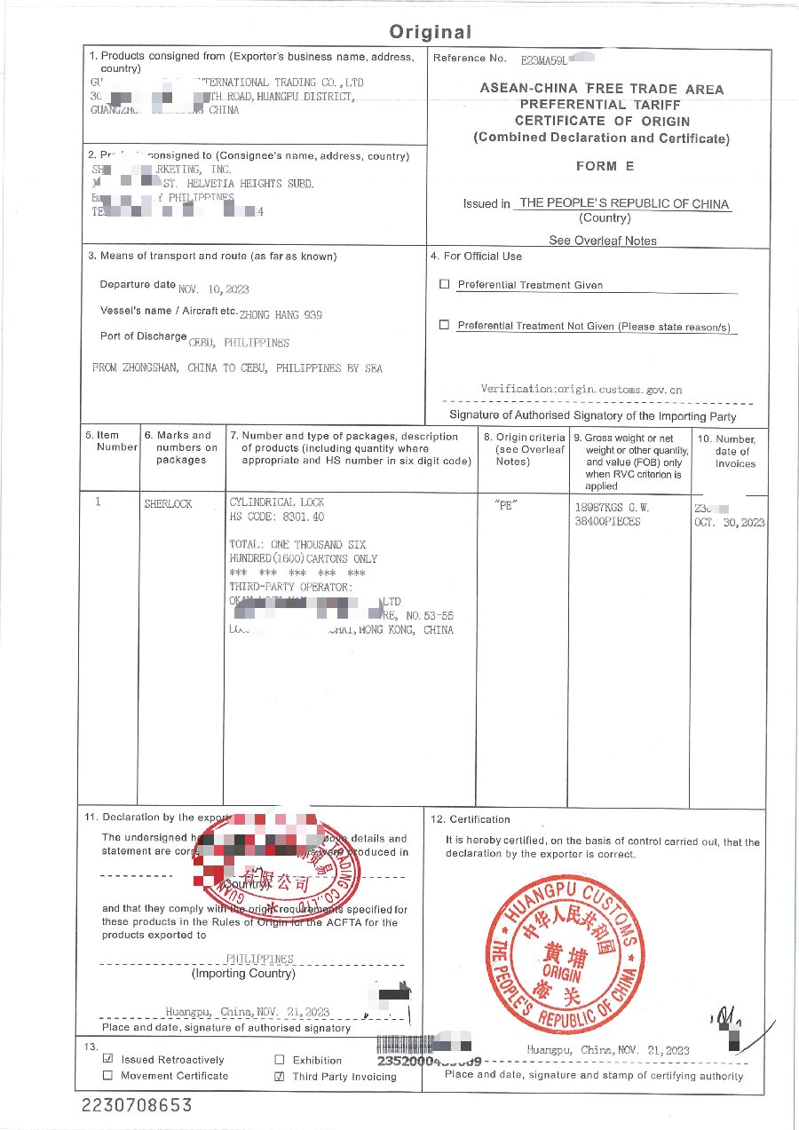 中國(guó)東盟自由貿(mào)易區(qū)原產(chǎn)地證-Form E