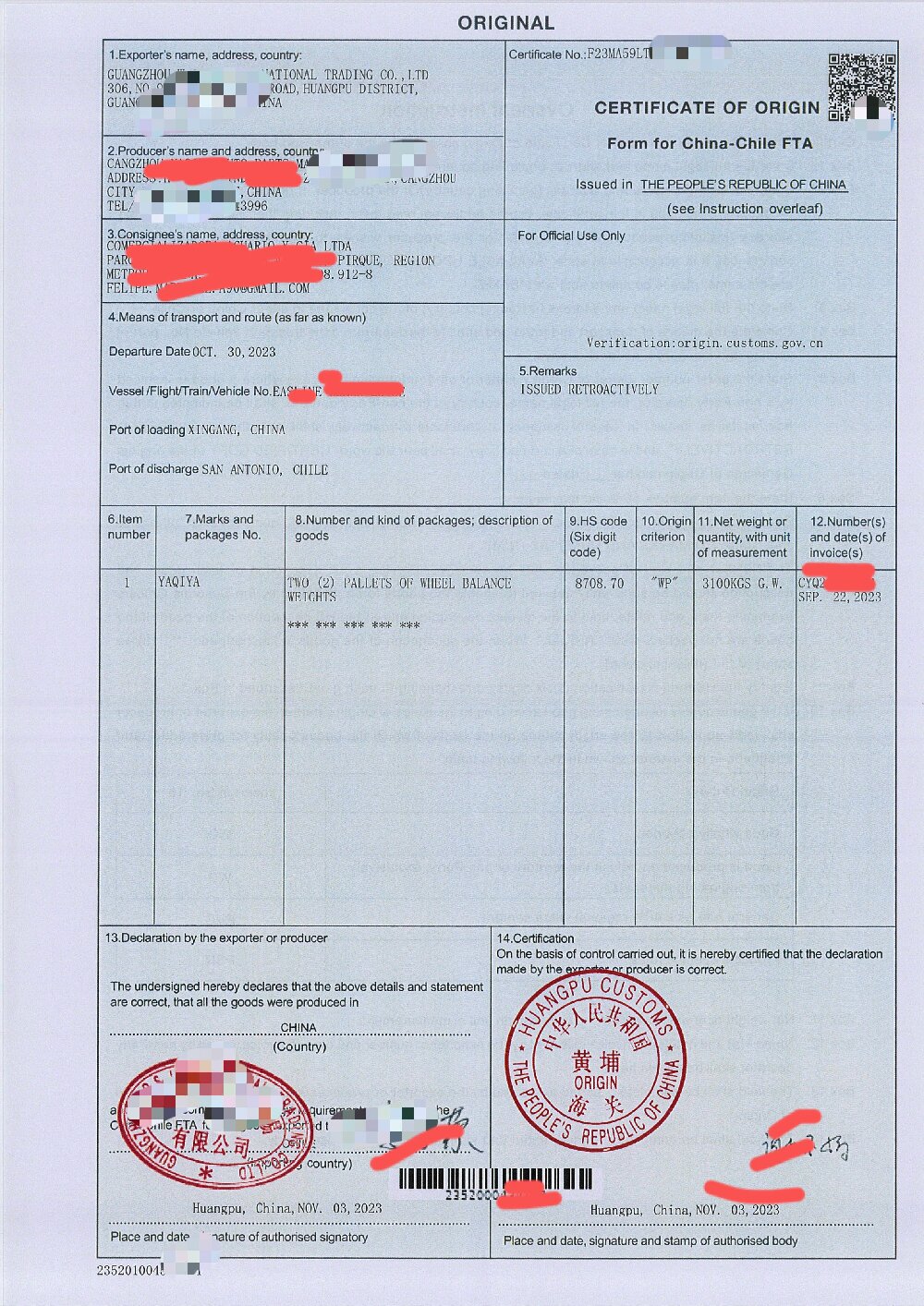 中國(guó)-智利自由貿(mào)易區(qū)優(yōu)惠原產(chǎn)地證-FORM F
