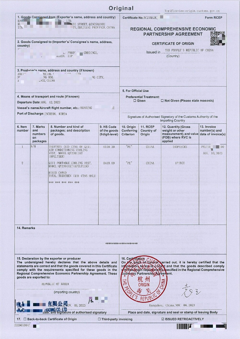 中韓自由貿(mào)易協(xié)定原產(chǎn)地證書
